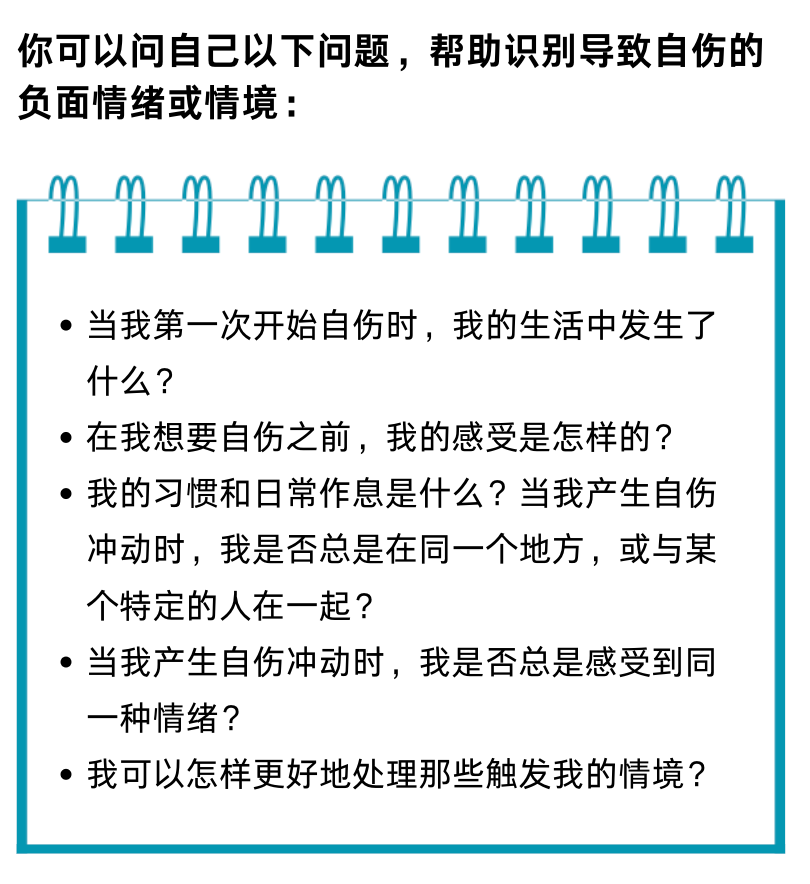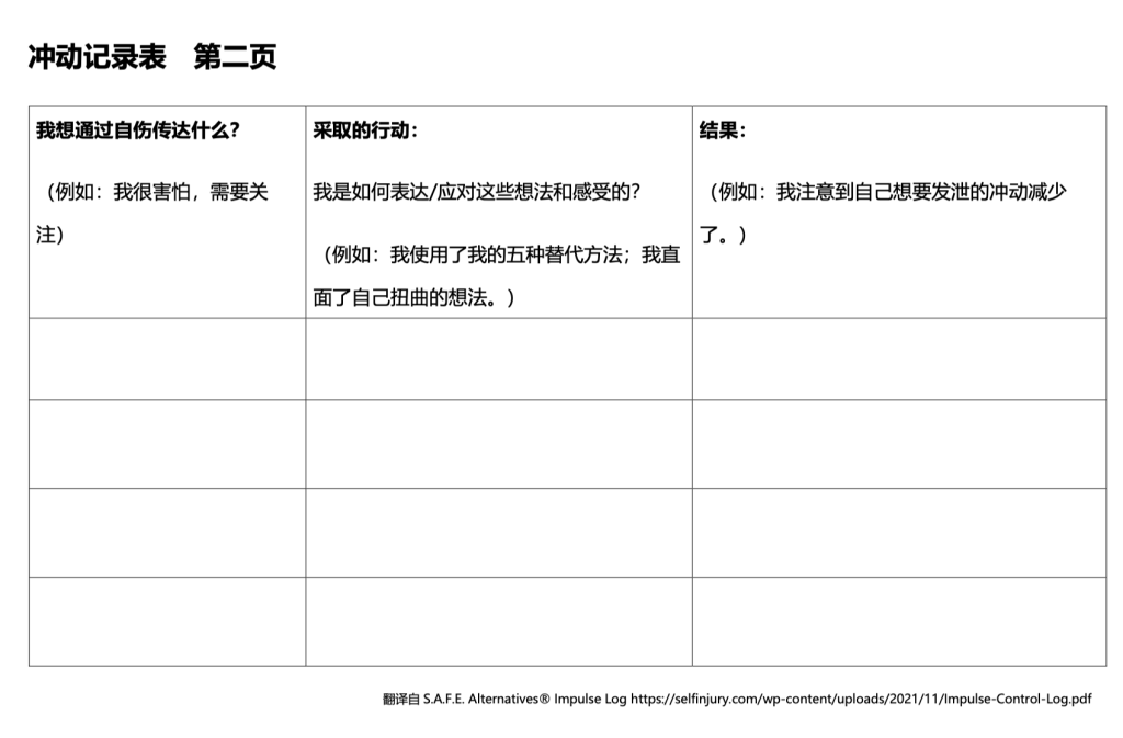 这张表格不是用来评判你的,而是帮你看清冲动背后的想法和感受,让你更了解自己。当冲动出现时,把它写下来,你会发现自己其实有很多选择,而不仅仅是伤害自己。(点击下载)