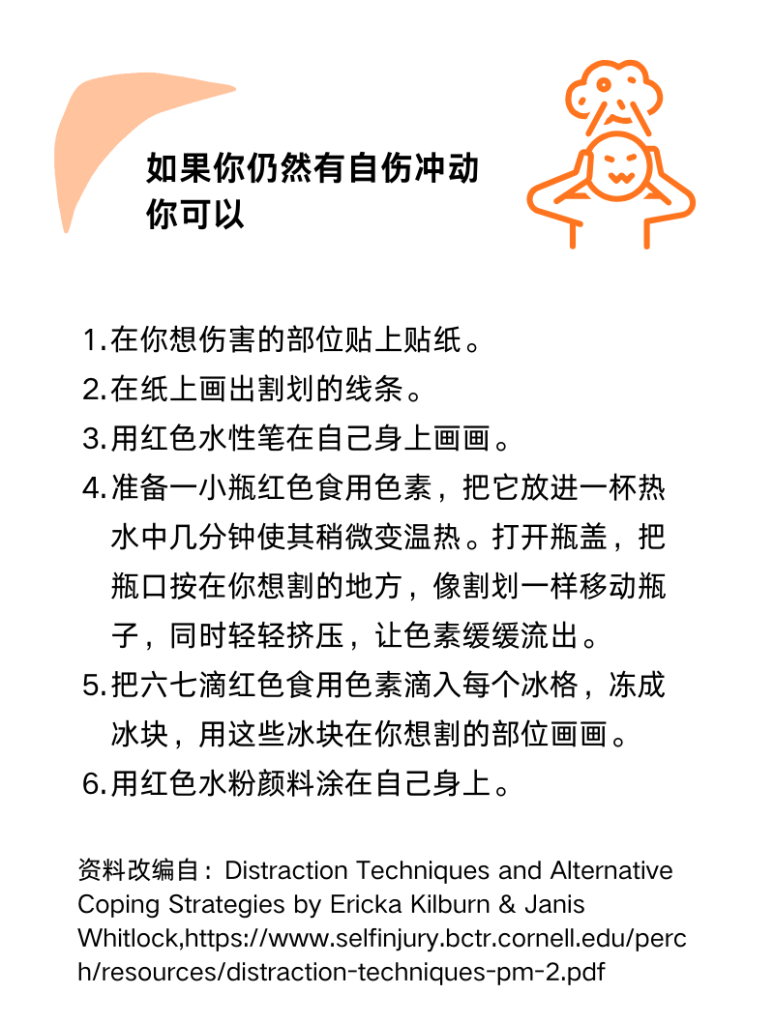 🧑:“感谢作者!我很长一段时间了都无法控制自己这样的状态出现,一直很矛盾,感觉这样很不尊重爱护自己,不想继续通过这样的方式处理问题,但是好像已经别无他法让自己冷静下来。尝试过情绪失控时直接握冰块,可以大大缓解我自伤的冲动,但还是无法彻底抑制这种冲动。”